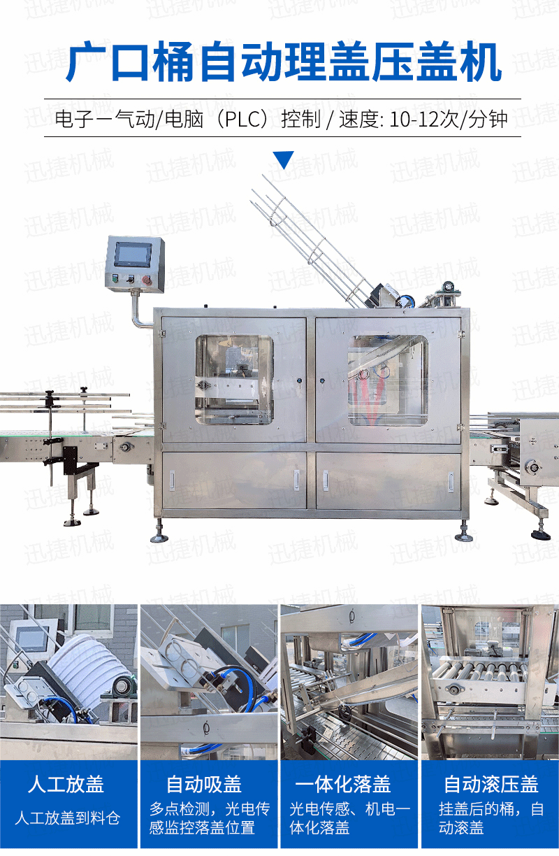 自動理蓋壓蓋機(jī)可以完成自動完成理蓋、壓蓋、輸送進(jìn)瓶、輸送出瓶等一系列操作,設(shè)備采用機(jī)械式原理,電機(jī)驅(qū)動,具有工作穩(wěn)定可靠,操作簡便,生產(chǎn)效率高,適用范圍廣等特點(diǎn)。廣泛應(yīng)用于各種規(guī)則的玻璃、塑料材質(zhì)的圓瓶、方瓶的壓蓋,是日化、化妝品、醫(yī)藥、食品等行業(yè)的理想壓蓋設(shè)備。