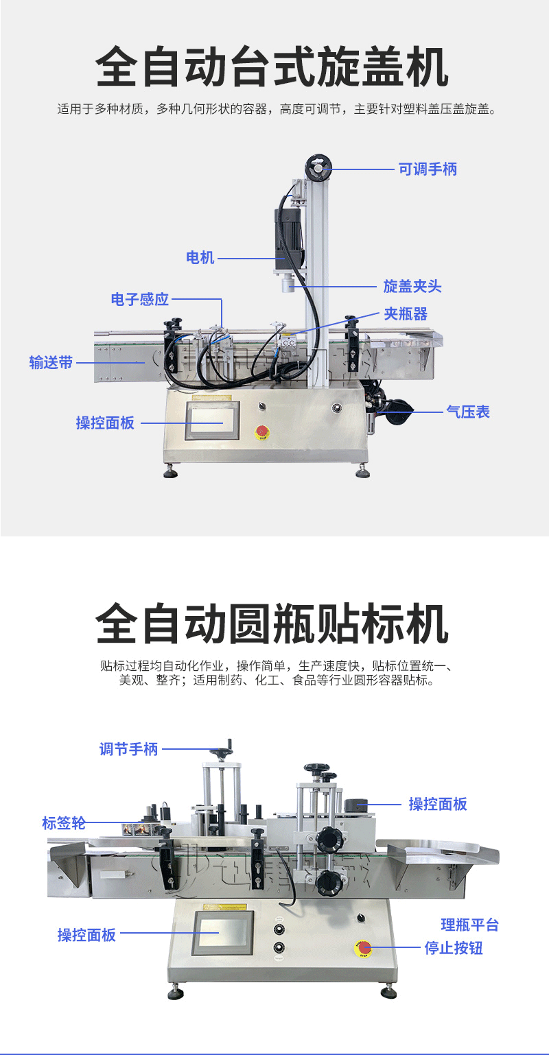 本設備主要適用于食品、日?;?、農(nóng)藥、醫(yī)藥和特殊行業(yè)。灌裝精度將受氣壓的穩(wěn)定性、物料的均勻性、灌裝速度等的影響。 產(chǎn)品說明:生產(chǎn)線根據(jù)灌裝范圍選擇型號,灌裝部分為雙頭下潛式灌裝機,適用于不同物料不同瓶子的灌裝,配備自動壓蓋機和圓瓶貼標機,可實現(xiàn)不同蓋子的旋蓋貼標工作。